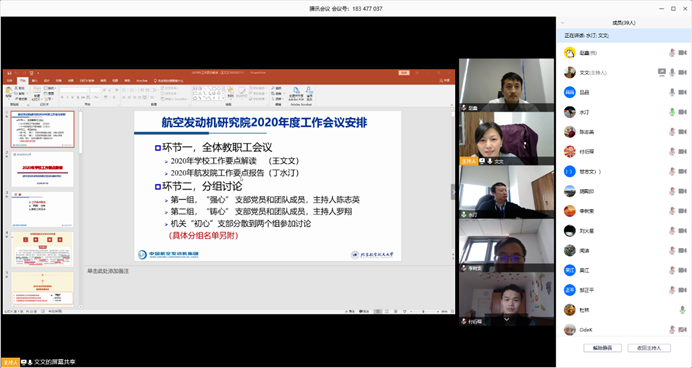 为把学校年度工作会精神传达至全体教职工,谋划和制定本单位年度重点工作并推进落实,航空发动机研究院和航空发动机国际学院(以下简称“两院”)于2020年3月11日星期三下午,召开2020年度工作视频会议暨本学期第二个“学习日”集体学习,会议由分党委书记王文文主持。