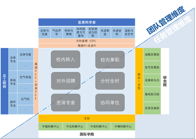 打破传统模式,创新管理理念。为落实“两院”协同决策、融合攻关、联合考评、互补投入和协同育人五大创新机制,强力攻关航空发动机这一世界最复杂的“硬骨头”,“两院”打破传统学院按学科方向分系管理的模式,实行问题导向的双维度管理理念——团队管理维度顶层由首席科学家、总工程师统筹,团队负责人负责团队建设;任务管理维度下设“四部一办”和中俄、中英、中德、中法四个国际联合科教中心,给科学家布朗运动式的科研活动加上目标明确的有效磁场,共同完成“两院”的建设目标。