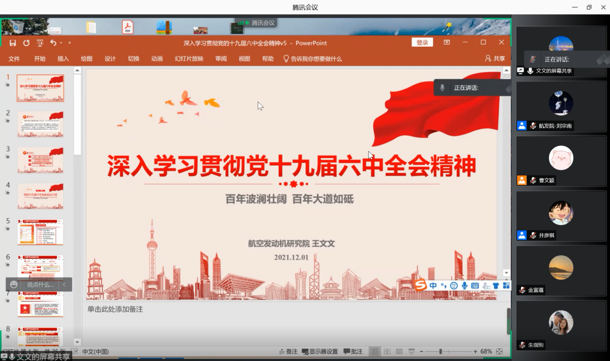 会议首先由航发院党委书记王文文面向全体师生宣贯党的十九届六中全会精神。她指出,要深刻领会全会精神,准确把握全会精神实质,以史为鉴坚定理想信念,实干担当,勇毅前行,把学习成果转化为大家工作与学习的动力,扎扎实实推进全会精神落地落实。