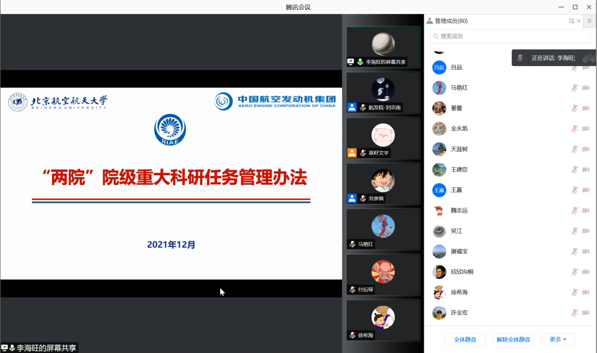 最后,航发院科研副院长李海旺对院级重大科研任务管理办法及任务申请和认定流程进行了宣贯和培训。他强调各团队、老师要按要求把握好时间节点,抓好落实,希望全体老师热诚参与到航发院有组织的科研任务中来。