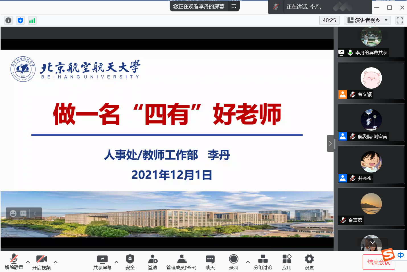 会议第三项,特邀学校教师工作部副部长李丹面向全院教师作题为《做一名“四有”好老师》的专题报告,深入解读了“四有”好老师的内涵,通过列举北航近些年来德教双馨的育人典范和高校近些年的失德失范案例,从坚持“高线”和坚守“底线”的角度,教育引导老师们落实好立德树人根本任务,履行好研究生培养的第一责任人职责,争做“四有”好老师。