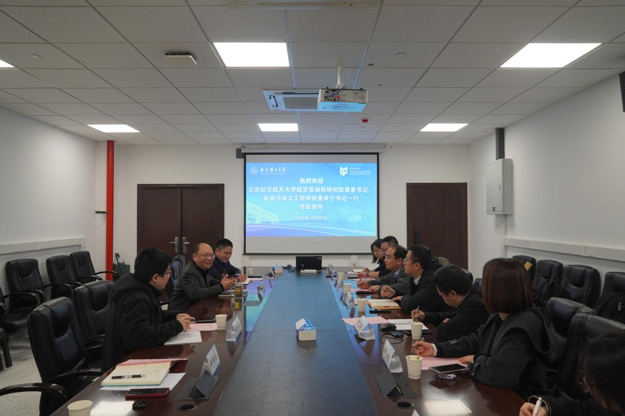 在南京理工大学,能动学院党委书记宗文干、副院长刘冬、党委副书记、纪委书记田野等参加了座谈交流。宗文干从党建引领、学科建设、师资队伍建设、国际交流等方面对学院进行了详细介绍。北航能动学院院长助理李育隆对北航航空发动机事业发展的整体情况进行了介绍。双方就创新人才培养、科研成果转化、教师考核激励等内容进行了深入交流。最后,与会成员合影留念。