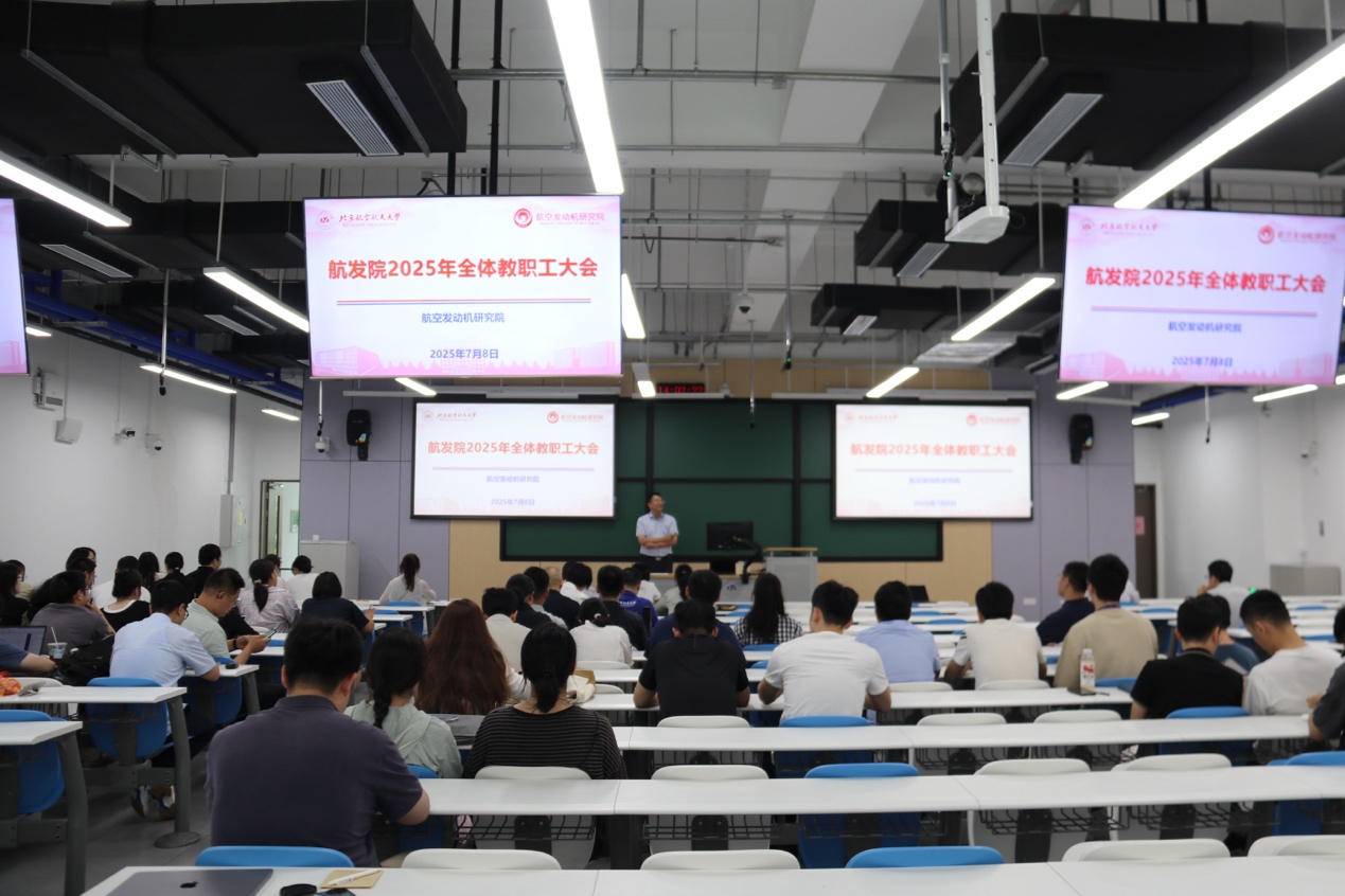 2025年7月8日下午,航空发动机研究院(简称“航发院”)在沙河校区SH3-101召开全体教职工大会。会议内容包括专题党课、2025年重点工作推进情况、制度宣贯与安全教育等。本次会议还进行了工会、教代会换届选举工作。航发院全体教职工参会,党委书记袁星主持会议。