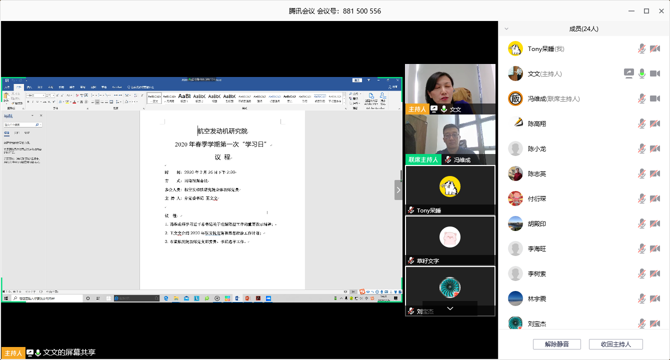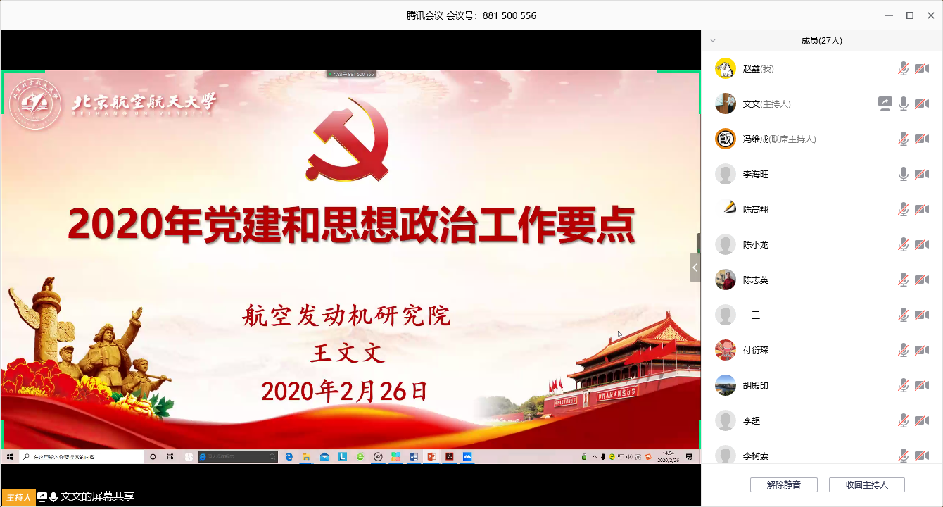 按照学校《关于2020年2月-3月师生“学习日”活动学习内容的指导意见》的相关要求,航空发动机研究院(简称“航发院”)于2020年2月26日星期三下午14:30召开2020年全体教职工党员春季学期第一次“学习日”视频会议,会议由党委书记王文文主持。