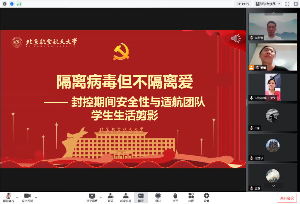 接着,支部委员王家俊同学分享了“隔离病毒但不隔离爱——疫情封控期间安全性与适航支部学生生活剪影”,鲜活地呈现了同学们的乐观与积极状态,也充分体现了年轻一代航发人的奉献与担当。支部老师纷纷表示,学生牵动每位导师的心,看到同学们疫情期间积极应对困难,有效自我调解和管理,非常地欣慰。支部委员刘晓静老师分享了团队老师们加入爱心车队送站返乡学生的暖心的故事;刘传凯老师还特别讲述了2003年非典期间,作为学生的他在北航封闭期间的日常生活。支部的每位党员都在用小小的行动奉献并温暖着疫情下的这座城市和身边需要帮助的人。