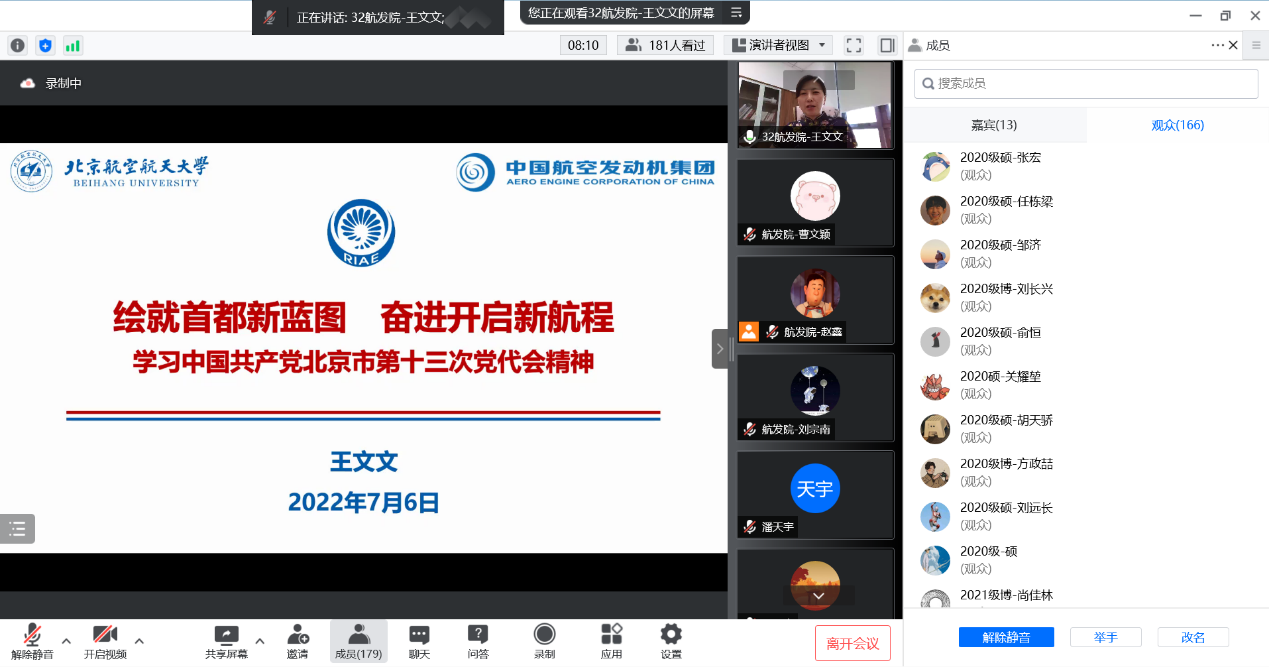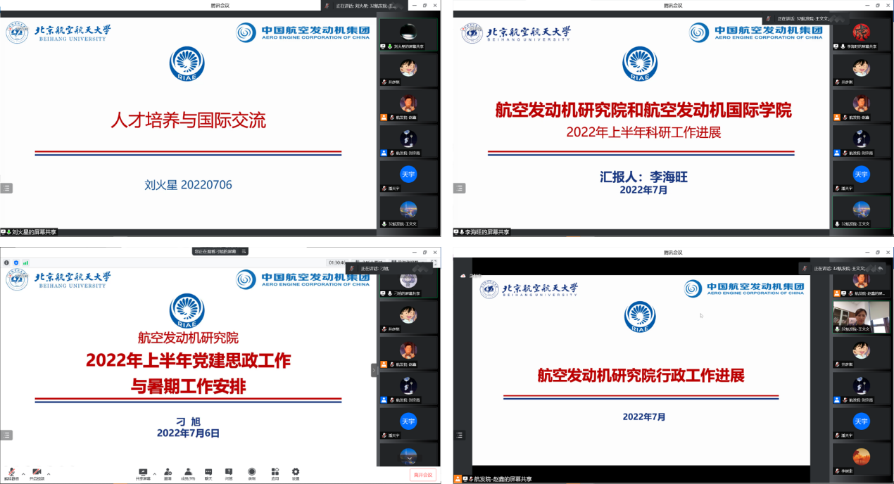 2022年7月6日下午,航空发动机研究院(以下简称“航发院”)召开专题党课暨全院教职工大会,会议以线上形式进行。会议宣贯了中国共产党北京市第十三次党代会精神,汇报了航发院上半年工作进展情况、并对暑假各项工作进行安排部署。会议由航发院党委书记王文文主持,全体教职工、学生党员和积极分子200余人参加了此次会议。