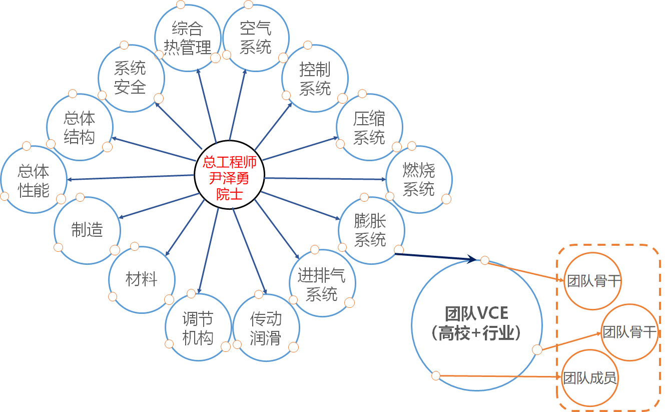 “两院”设置总工程师岗位统筹14个关键技术团队工作,由国家科技专项发动机工程总师尹泽勇院士担任。每个关键技术团队设置副总工程师(VCE)1-2人,分别来自高校和行业。每个团队可根据团队任务需要设置团队骨干和团队成员岗位若干。